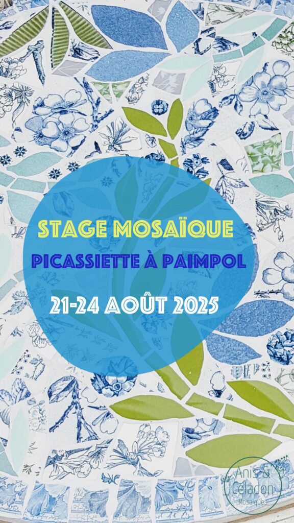 Hors les murs, dédié à la « mosaïque Picassiette » (à partir de vaisselle ancienne): Stage de 3 jours et demi fin août à Paimpol, en Bretagne. Dates définitives: du 21 au 24 août 2026. Les inscriptions sont ouvertes!